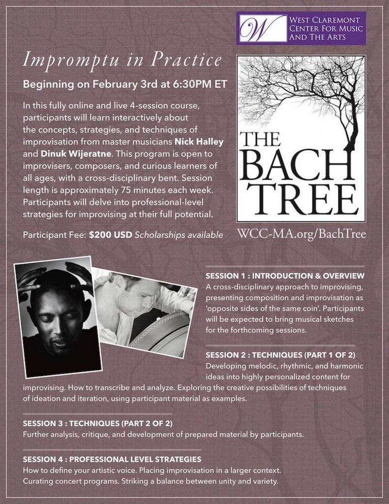 A program of the West Claremont Center for Music and the Arts (New Hampshire), The Bach Tree project seeks to cultivate creative and collaborative musicians. In response to the covid-19 pandemic, the Bach Tree has gone online and is offering a series of month-long courses through an online academy. Join Nick Halley and Dinuk Wijeratne for the month of February to learn interactively about the concepts, strategies, and techniques of improvisation through a 4-session online Zoom course. The program is open to improvisers, composers, and curious learners of all ages, with a cross-disciplinary bent. Each session is about 75 minutes. Begins Feb. 3, 2021 at 6:30 pm ET. To sign up and for more details, visit: wcc-ma.org/BachTree.