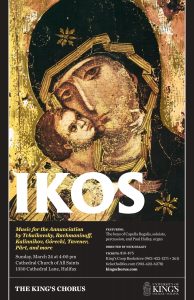 The King’s Chorus, under the direction of Nick Halley, presents their spring concert, “Ikos.” Falling on the Eve of the Annunciation, this feast of song will feature music written by some of the most prominent composers of the Eastern tradition. Joined by members of Capella Regalis, soloists, percussion, and Paul Halley on the organ, the Chorus will achieve a surround-sound listening experience through the lush acoustics of the Cathedral and by singing from each corner of the vaulted building. The splendid Hymn…